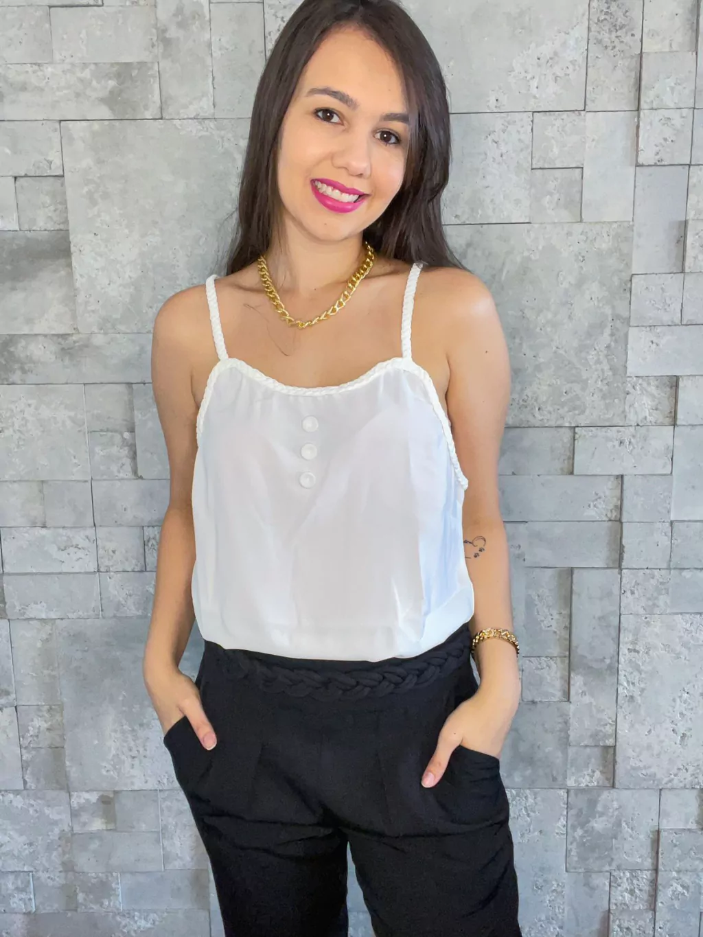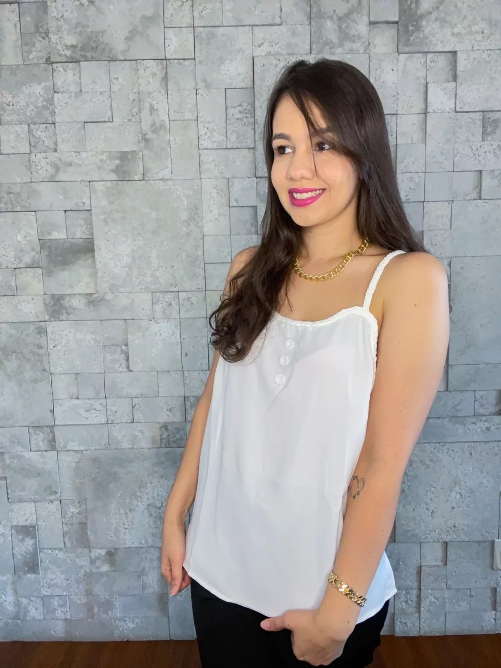 Blusa de alça Trançada com caimento impecável e modelagem confortável com tecido com toque Crepe de Seda, base 100% poliéster. Detalhes com 3 botões encapados.